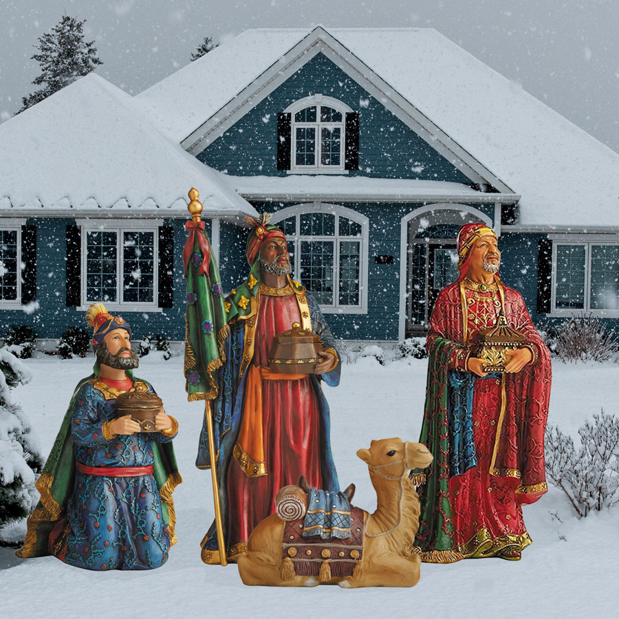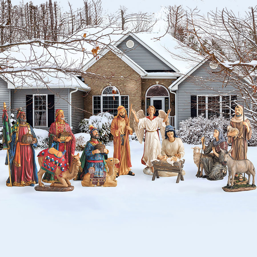 Real Life, metal, two-dimensional Nativity set. There are 12 pieces, with the tallest figure measuring 51 inches. This nativity set is durable and easy to ship and store. The pieces are printed with high resolution paint that resists fading. The super hi resolution images painted on flat metal give a remarkable illusion of the peices being three dimensional. Each piece comes with durable, three pronged metal stakes to anchor them to the ground. Each piece also come with brackets that can be attached to rods (rods not included) for extra stabilization in windy areas.