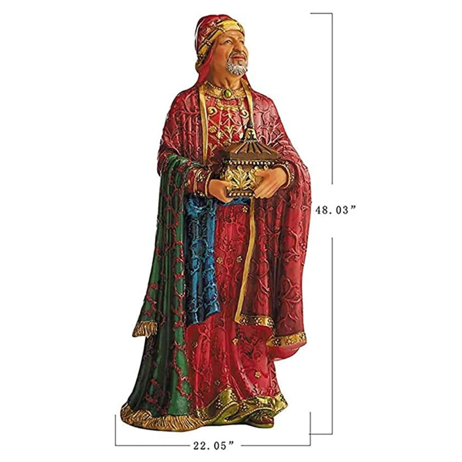 This is an all metal, two dimensional four piece Three Kings and Resting Camels. It includes King Gaspar, King Melchior and King Balthazar and the resting Came. King Balthazar is the tallest figure at 51.5 inches. The all metal pieces are printed with high resolution paint that resists fading. These super hi resolution images give the remarkable illusion of the pieces being three dimensional and the details show with such clarity that the Christmas Story is truly brought to life. Set up is a snap and each pieces comes with durable, three pronged metal stakes to anchor them to the ground. Each piece also comes with brackets that can be attached to rods (not included) to help stabilize the pieces in windy areas.