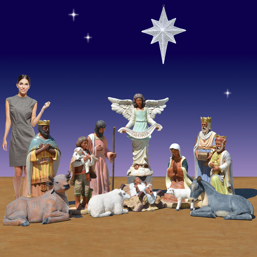 The 12-piece African American Nativity scene is part of the Christmas Night Nativity Collection and includes many of the same figures from the 6 foot and 54 inch scale Nativity sets, but in a smaller scale. The 12-piece set includes the Holy Family, the Three Kings, the Angel of Gloria, a shepherd, a donkey, an ox, a sheep and a baby lamb. The 12-piece Christmas Nativity set does not include several of the sheep and Camel, though those pieces may be purchased separately, if desired. The Star of Bethlehem Item 15051 is not included. The 12-piece set from Christmas Night Inc. is designed by Christmas Night Inc. in a traditional style.