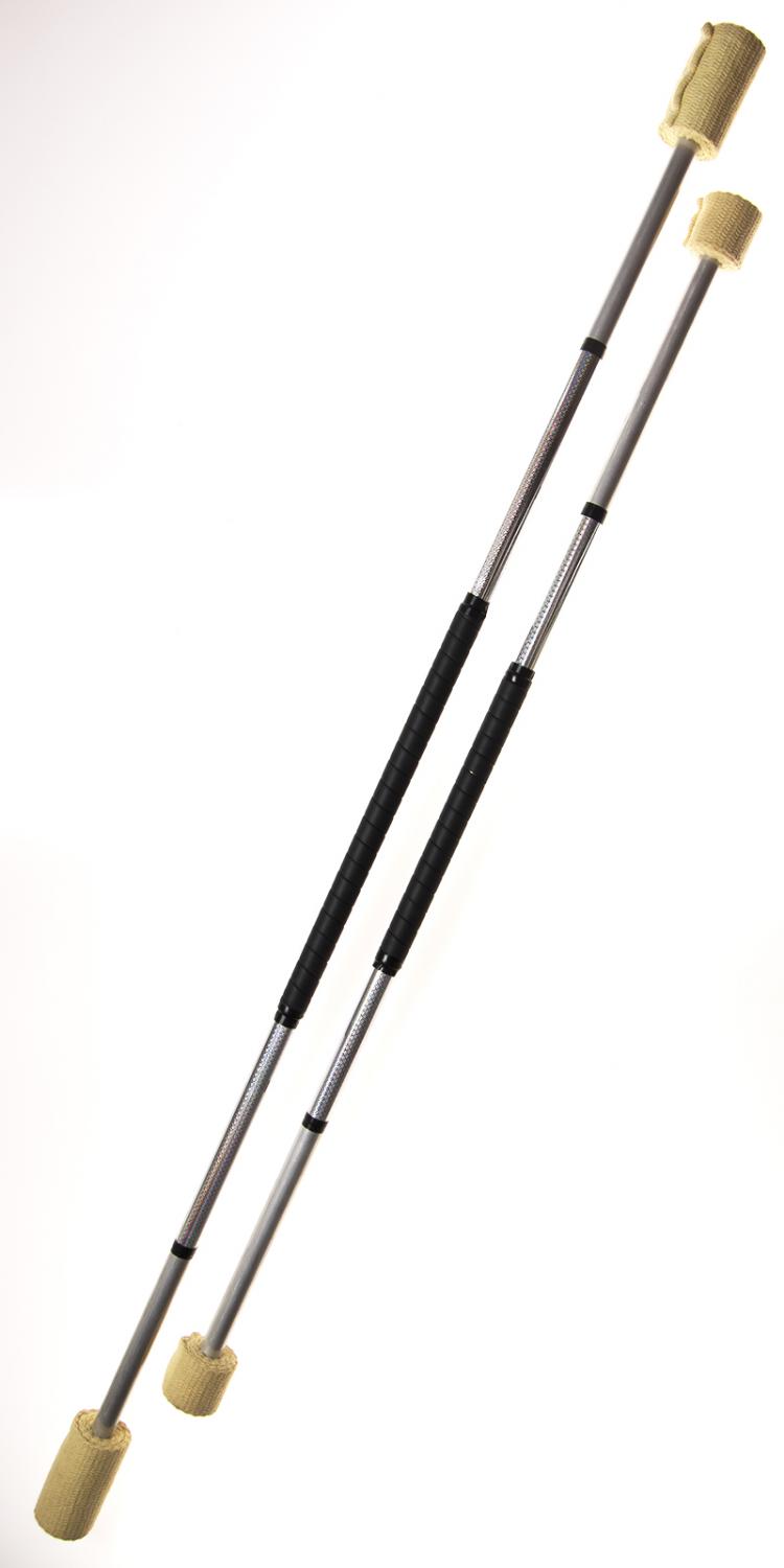 The Aluminum fire staffs Comes in mutiple lengths 6 feet- 3 feet. If the staff is 4 feet or less , 2 inch wide wick is used. All the longer staffs have 4 inch wicks. The aluminum staff is made with 7/8 inch diameter T-6 tempered aluminum and is constructed with a wood plug in the end. The wicks are attached with self tapping screws. To select the proper size, the staff should come to about your chin or nose for single staff work and your chest hight for double staff. It you are over 6 feet tall you can special order a longer staff, just contact us with what you want at no extra charge. Each staff has holographic silver decorations at each end.