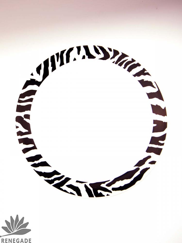 The 32 cm (12.75 inch) diameter Mister Babache Flat Juggling Ring is a solid plastic (not hollow) ring best suited for solo numbers juggling with 5 or more rings. The thin width (1/8th inch) reduces the chance of edge collisions at the top of the juggling pattern and allows you to hold up to 4 rings in one hand. The Zebra pattern is painted onto the ring, so you need to be caerful not to scratch it.