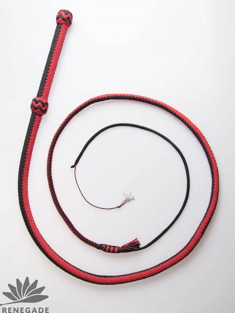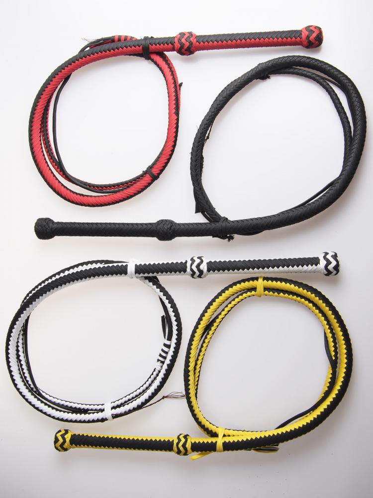 These are made from nylon and are very easy to crack, they come in bright colors and two lenghts5 and 6 ft long. The nylon whip is very good for beginners to experts, in general a nylon whip is easier to crack than a leather one and is much cheaper to purchase. The whips are cusmtom made for us without the wrist strap at the end of the ball and a short whip fall. The whips come with 5 extra crackers.