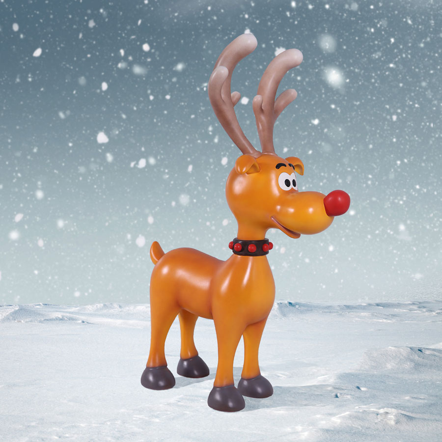This Cheerful Reindeer, will add a touch fun to your Christmas decorating. This large reindeer is rich with comic style detail. It is crafted in durable chip-resistant fiberglass.