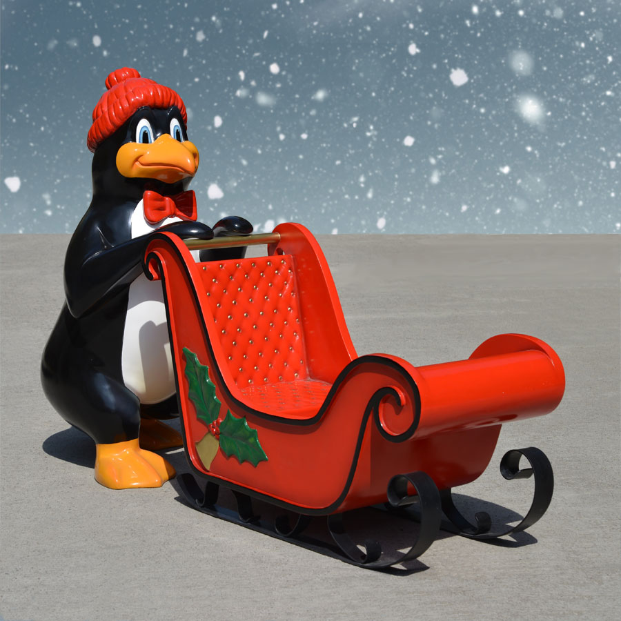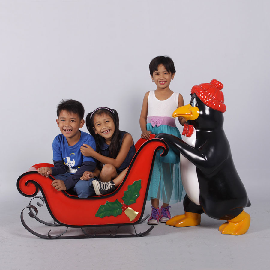 Christmas isn't just a North Pole holiday! This 39-Inch Christmas Penguin with Sleigh is a great treat for kids in the living room, at a town park or while their parents are shopping. The Antarctic penguin is dressed in a cozy red hat and bow tie as he pushes his sleigh through the snow. Use the sleigh to collect charitable gift donations or to let kids sit for a photo op. Both the Christmas penguin and sleigh are made of fiberglass for long-lasting use.