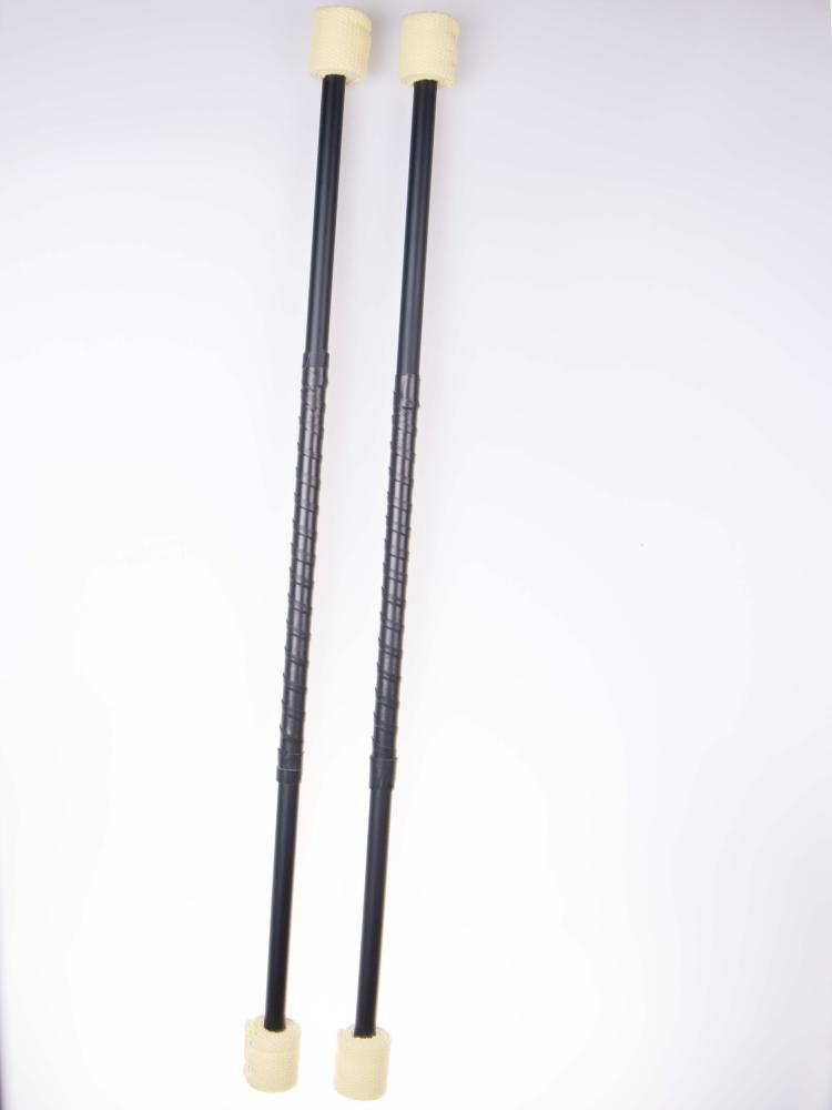 This is a very nice sized double fire staff, with a lenght of 35.5 inches (90cm). It is light weight 300 grams each. It is made from anodized aluminum tubing 19 mm (3/4 inch) diameter. The wicks are 2 inch wide.