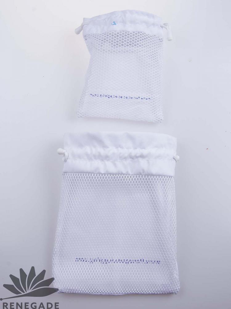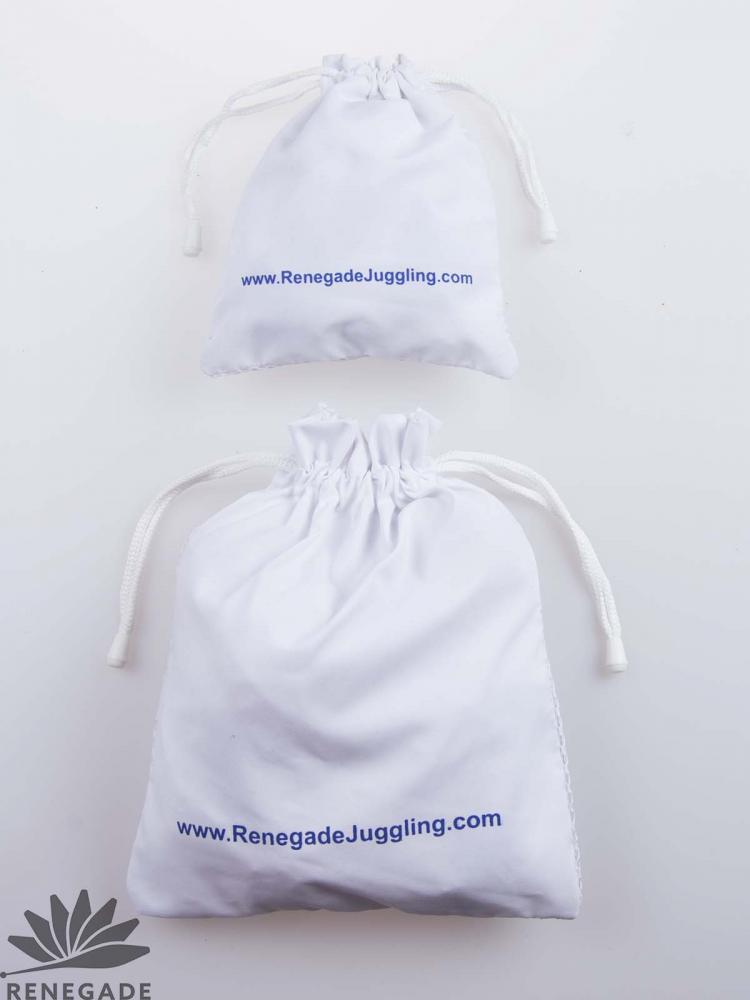 This storage bag has a mesh back so you can see which sets of balls you have inside. The white fabric is non-marking and comes in 2 sizes: small (7 x 8 inches) which holds 3 to 4 juggling balls, and large (12 x 9 inch) which holds 3 to 9 balls. The number of balls that fit is of course dependent upon the size of the juggling balls.