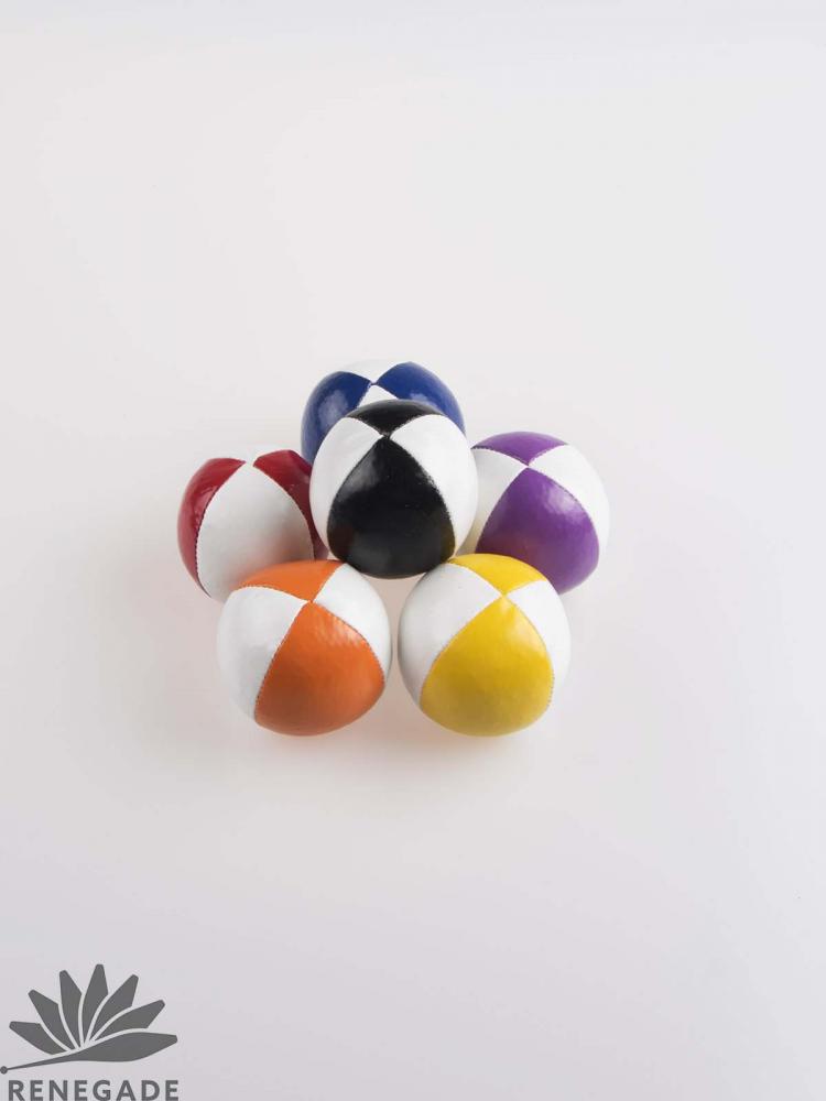 These are the most common jugging balls, and are made of a vinyl (PVC) coated cloth and filled with bird seed. The beanbag ball (though never actually made with beans) is great for juggling because the ball will not roll when dropped, nor will it bounce off another ball if there is a mid-air collision. This ball is the softest type of juggling ball, with a very squishy feel. There is a wide variety of juggling balls that look essentially the same as this ball. The difference between these various beanbags is the quality of fabric and thread, how well they are sewn together, and the precision of the beanbag weights. Juggling balls made in China tend to be of very low quality, which we do not sell. Our vinyl beanbag juggling balls comes in 5 sizes.