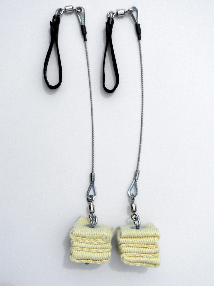 Blaze Balls are a monkey fist knot tied around a wooden ball and metal eyebolt that is attached to the chain or cable with a swivel. Advantages of Blaze Balls over cathedral are: long burn times, improved longevity, reduction of exposed metal hardware (hot metal), a round shaped flame and clean look. Different sizes (2.5", 3.0" and 3.5") are available which directly relate to your personal preferences for weight, burn time and size of flame during performance. The most common Blaze Ball size used on fire poi sets is the 3" ball.
