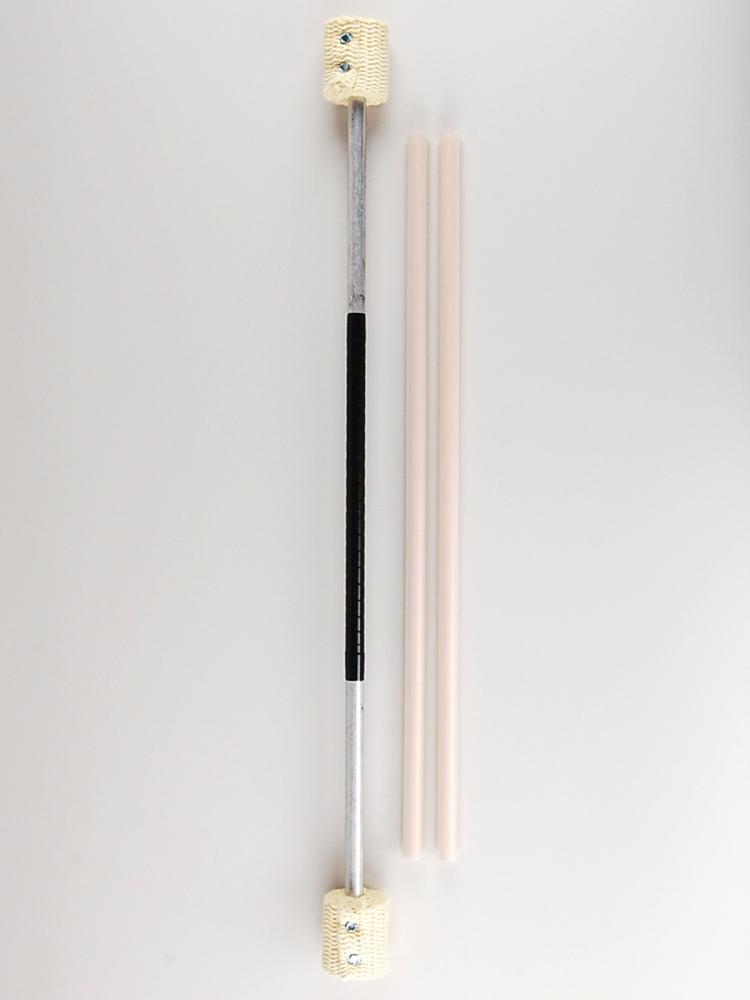 A good prop for street performing, or for baton twirling. The shaft is made of 1/2 inch T6 tempered aluminum. There is 2 feet of kevlar wicking on each end, the total lenght is 26.5 inches long. The fire devil stick comes with a pair of wood/silicone handsicks.