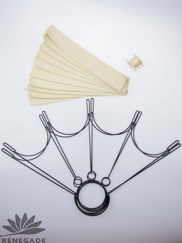 Save money and have fun wicking your own set of fans. The kit includes two fan frames, ten pre-cut Kevlar wicks, Kevlar thread and a curved needle. It is easy to wick the fans yourself. Though it takes sometime to do it. Simple insert the wicks through the loop and the end of the fan. Wrap the wick tightly around the loop, fold over the edge and sew. Do not do a running stitch. It is better to do several stitches, tie if off and repeat. Then if the thread did burn through, the seam would not unravel. One other sewing tip, tape the wick on the loop wiht elcetric tape, so it stays in place and tight. While sewing move the tape as you advacne your seam.