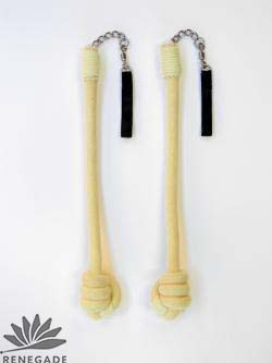 The chain is connected to three feet of, 1 inch or 3/4 inch diameter rope internally riveted to the chain and finger loops. Rivet surfaces and the ends of the rope are finished with a wrap of wick to eliminate fraying at the ends and exposure to hot metal.