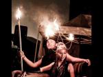 If you want to have a special appearance on the stage, the Fire Crown is a good choice, they are pieces of art, hand made. The fire crowns are made of copper tubes and wires. The size is adjustable, you can bend the copper tubes and wires, so they fit it well on your head. The weight of a three-section crown is about 450 grams, and burns for about 5 minutes or so. Only use lamp oil, do not use white gas. Make sure you shake off excess fuel, and always wear a hat or black cotton beanie for hair cover, to be safe. Black welding hats are very good/cheap and can be purchased at any welding supply store.