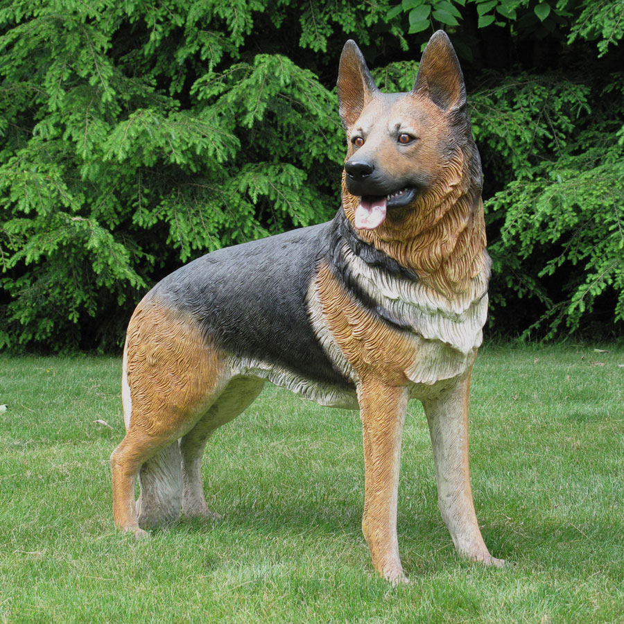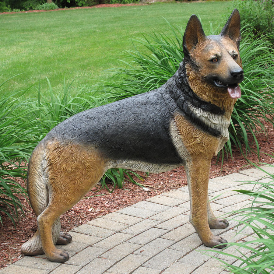 Standing 39" high, one of the most striking things about this German Shepherd statue is its lifelike size and stature. This elegantly detailed garden statue is made from fiberglass and looks just like the real dog breed. Each statue is painted by hand to ensure that it looks as lifelike as possible, right down to the iconic German Shepherd coloring. This fiberglass dog statue is light enough to move yet strong enough for outdoor use.