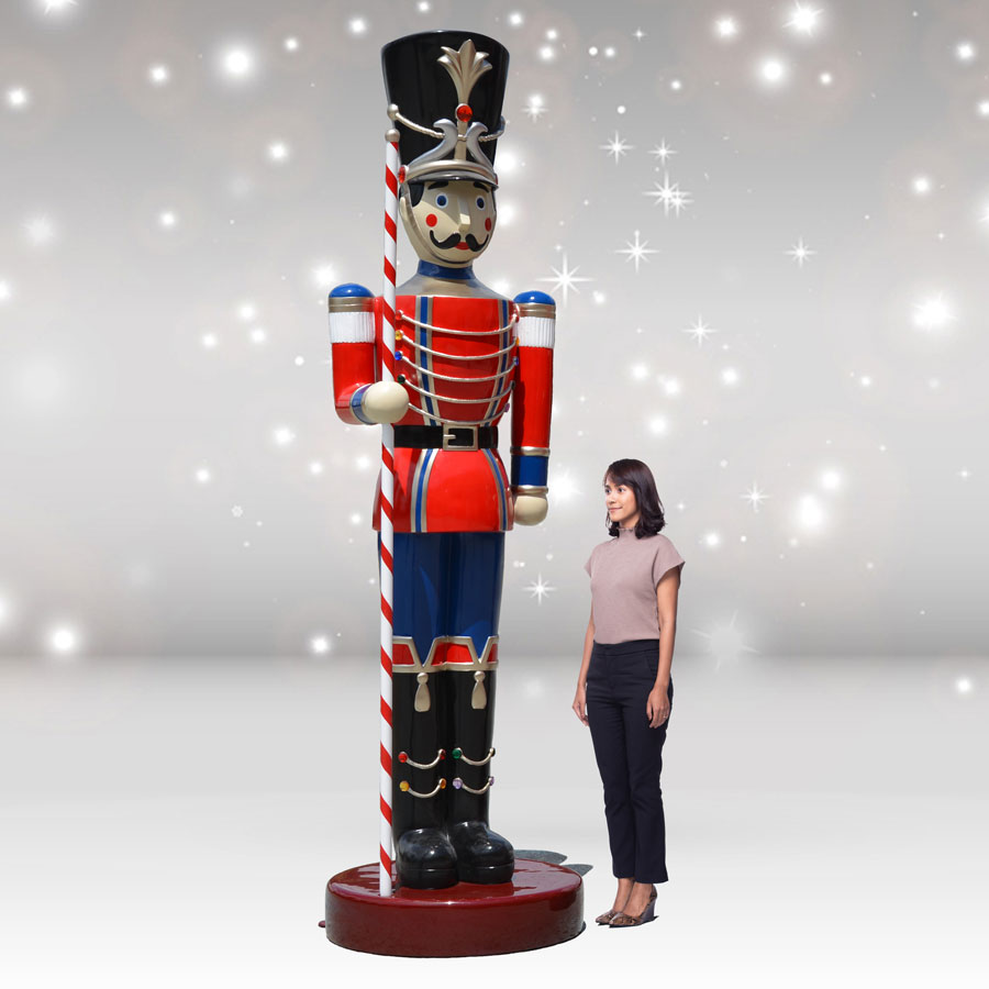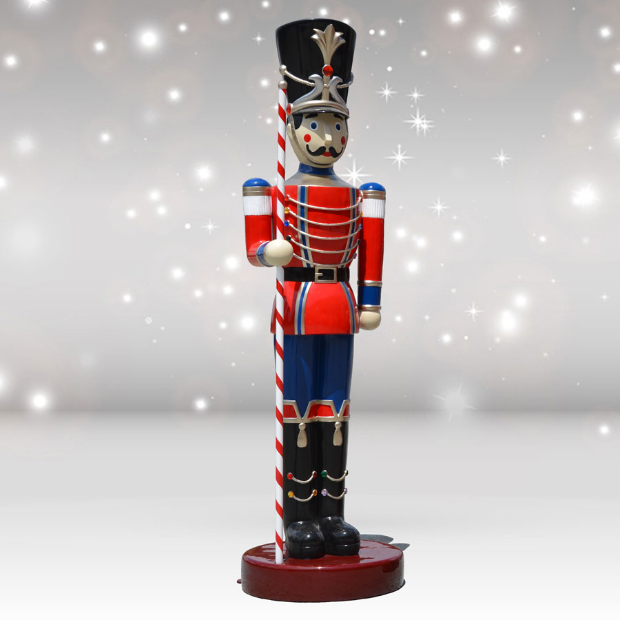 Everybody who comes by your home or business will be impressed with the stature that this giant Christmas toy soldier brings to a display. With chip-resistant fiberglass construction and a stable pedestal mount, he will stand attention proudly for many Christmases. The red overcoat and blue uniform pants are strikingly detailed, and this 10-foot toy soldier figure has a candy cane baton in his right hand as if ready to march away. Combine childhood joy with adult wonder at hotels, zoos, convention centers and more.