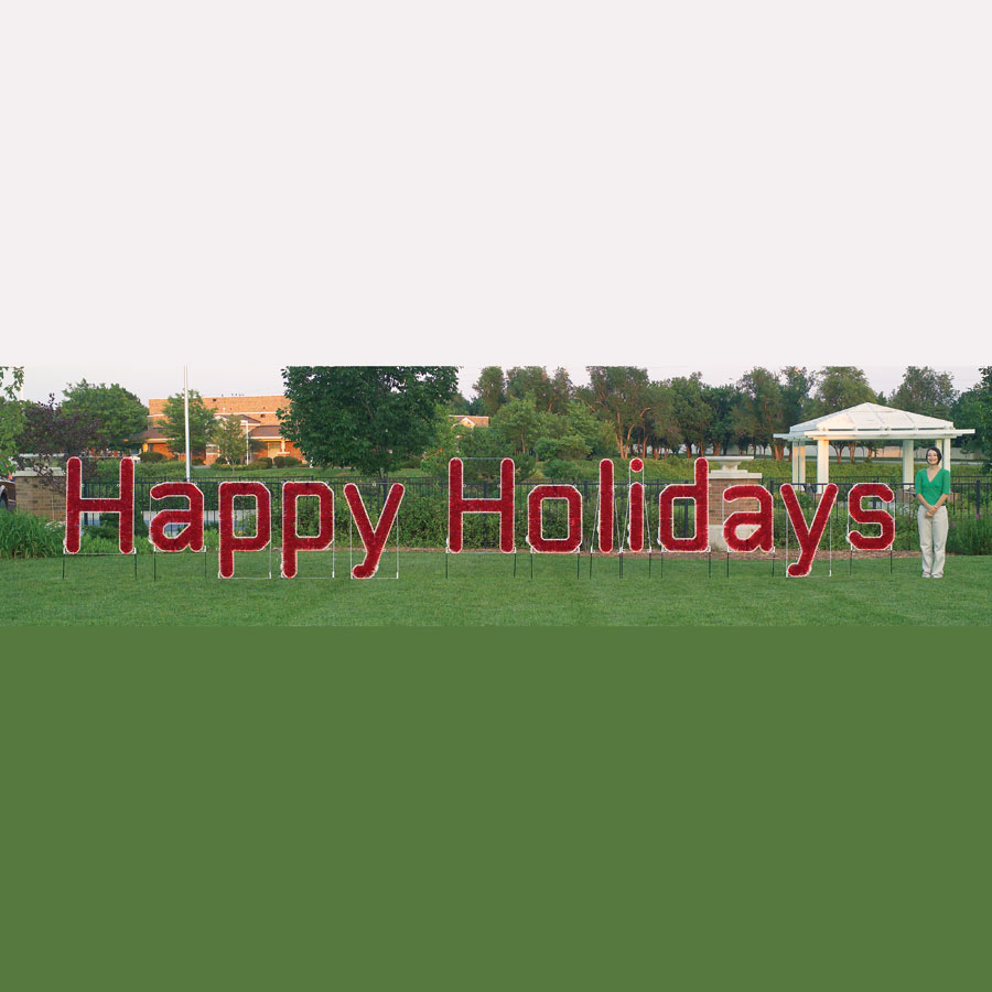 Turn your property into a cheery holiday wonderland with this larger-than-life garland and LED "Happy Holidays" sign by Holiday Lighting Specialists. Uniquely designed for an attractive display day and night, the sign is hand-made with 2,354 high-grade LEDs (rated for 50,00 hours of use) and high-quality, hand-cut garland. This ultra-versatile commercial holiday sign may be securely ground mounted using the included guy wires and ground stakes. It features an integrated wiring harness that connects to each letter and requires only a single extension cord for powering the entire display. Each letter has its own individual frame.