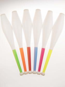 The Henrys Delphin Long club is constructed with a stiff 5/8 inch (16mm) wood dowel and a tube handle. It is a good light-weight choice for beginners or for advanced numbers juggling of 5 or more clubs, and is similar in size to the Renegade 85mm club. The club body is long compared to most other clubs, and the handle is relatively short. The tube handle is harder than a Renegade taped handle, but still slightly soft and has some give. The center of the club where the handle connects to the body is cleanly covered with a plastic ring. All Delphin models use flat caps and semi-round knobs made of EVA, a type of soft crepe rubber. The clubs are 20.5 inches long and are made in weight-matched sets that range between 205-213 grams per club. You can now select any combination of cap, body, center ring, handle and knob color to customize your clubs.