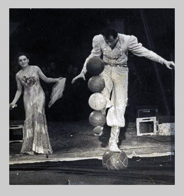 This type of ball is a very old idea. Jugglers in the 1800s and 1900s used partially filled balls for balancing. Many old jugging acts finished their show with a balancing pose, and many of these balls were partially filled to make the trick easier. Jugglers of that time most likely also used partially filled balls for toss juggling. In those days, jugglers were very secretive and never shared props or technical information with their peers. It is often disputed/wondered if Enrico Rastelli used Russian balls. From video footage, it appears that this is not the case, as you cannot see any ball wobble (a telltale sign of a Russian ball) when thrown in the air.