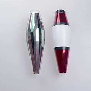 Three of the club boides sizes can be ordered decorated. The long body (Delphin), the short bodies (Pirouette) and big body (Albatros) come in two decoration styles. The Europ, with a top and bottom cone and Circus strips of silver and colored mylar. The decoration does add some weight to the clubs, around 10 grams. All the parts to make a decorated club are the same as un-decorated clubs, other than the foils on the body. On the order page you will see the names called Circus 1/8 M, that means there are 8 strips of decration. On the Albatros body it is call Cirus 1/10 M because the body is bigger they need to use 10 strips of decoration.