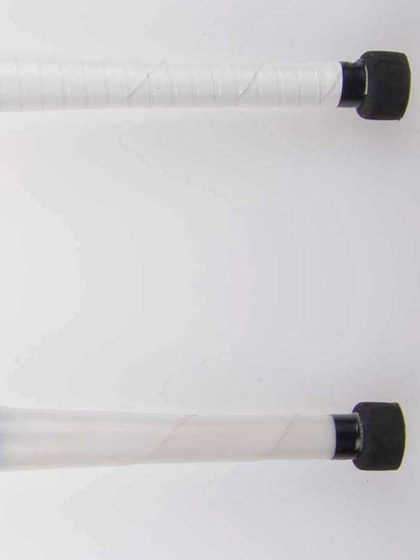 The thinner plastic (0.20”) is used to make a taped handle club. The handle is wrapped around the club and then covered with (0.01”) white vinyl tape. This handle is the softer of the two options and is often preferred by beginners because the softness reduces hand pain from catching clubs.