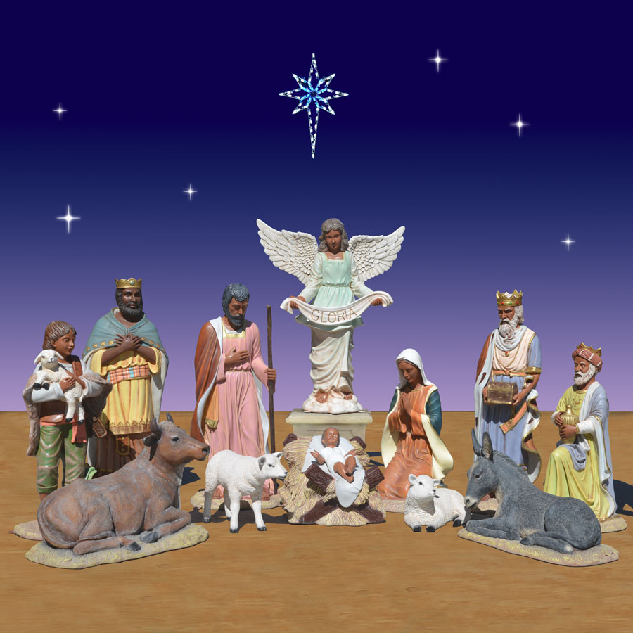 Figures in the 12-piece African-American Life-Size Nativity Set are made using a patented 8-step manufacturing process. The figures are part of the Christmas Night Nativity Collection and are made of high-quality fiberglass resin. They are light enough to move around, yet durable enough for outdoor use. The fine finish allows the valuable Nativity figures to maintain their beauty for years to come.