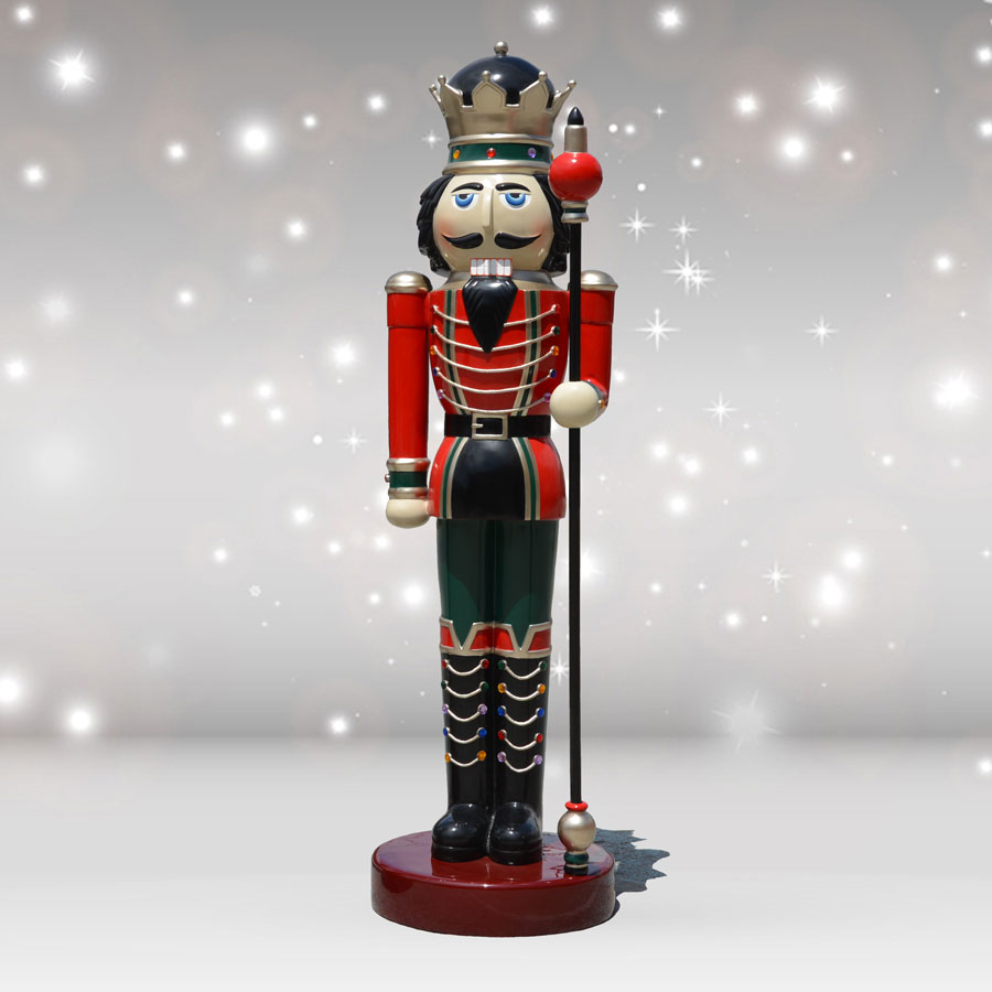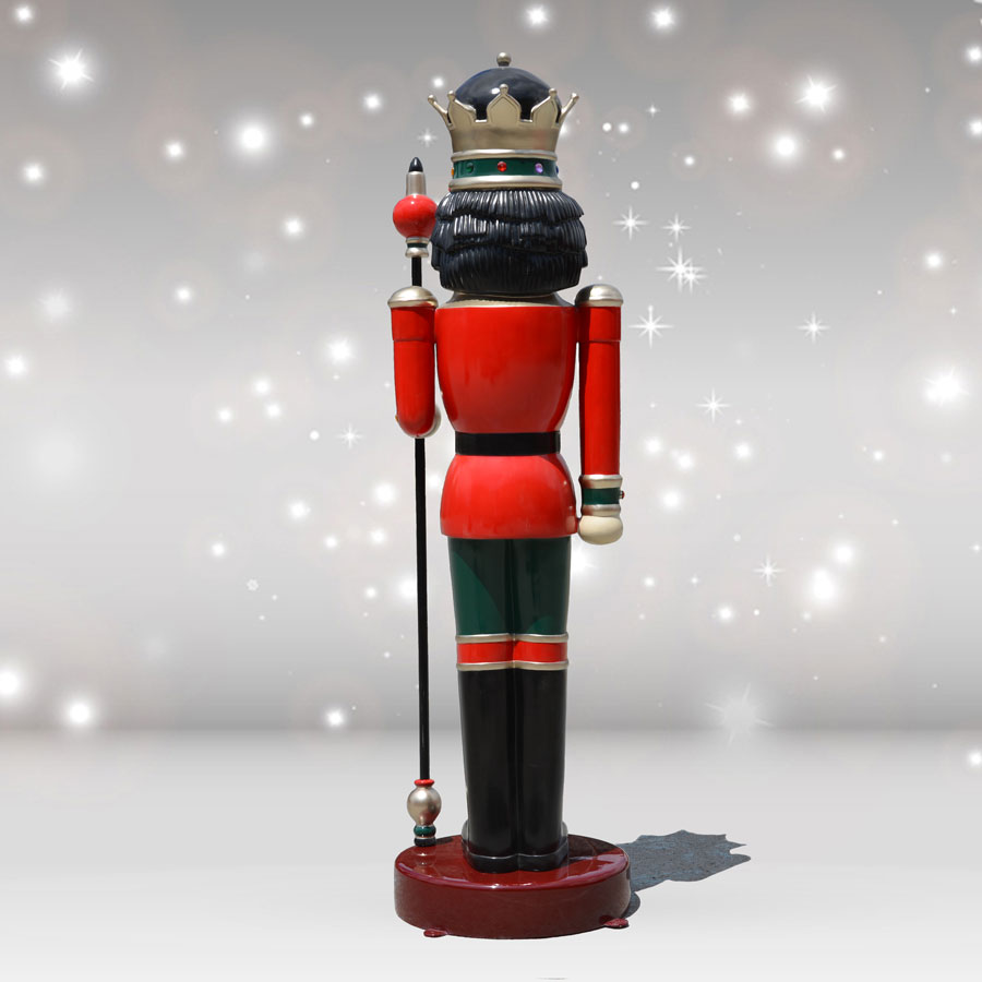 Standing at 78 inches high (or 6.5 feet), this intricately detailed nutcracker king stands at rapt attention with his scepter in his left hand. Featuring a red jacket and other embellishments in gilded gold, beautiful black and other surprisingly colorful details, this high-end fiberglass decoration will provide year after year of quality décor. Suitable for either indoor or outdoor use, this chip-resistant fiberglass decoration is meticulously painted and will provide you many years of childlike charm and seasonal joy.