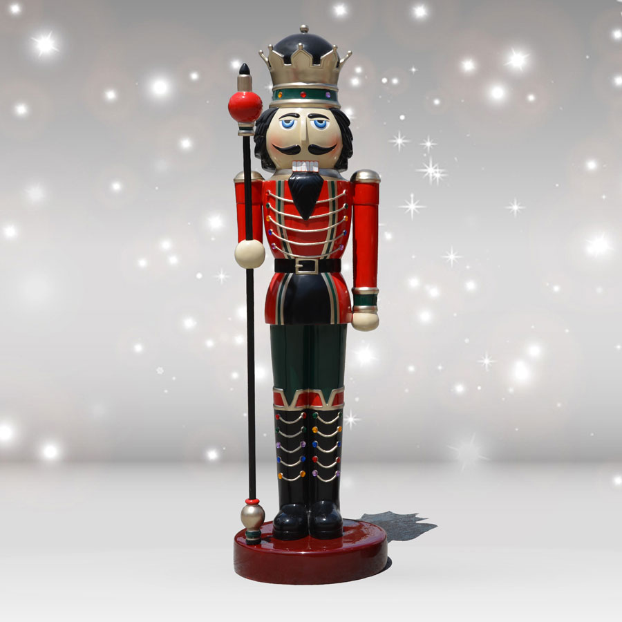 Designed by Christmas Night Inc. and made by Heinimex, this absolutely stunning life-sized giant nutcracker figure is an essential for your traditional indoor or outdoor holiday display. It is constructed from chip-resistant fiberglass that's durable enough to withstand the elements. All of the giant Christmas nutcrackers from the noteworthy Christmas Night Nutcracker Collection offer exceptional detail and exquisite embellishments, including meticulously painted facial details and glossy, gold finishes. This life-sized nutcracker statue is depicted carrying a scepter for a classic finishing touch.
