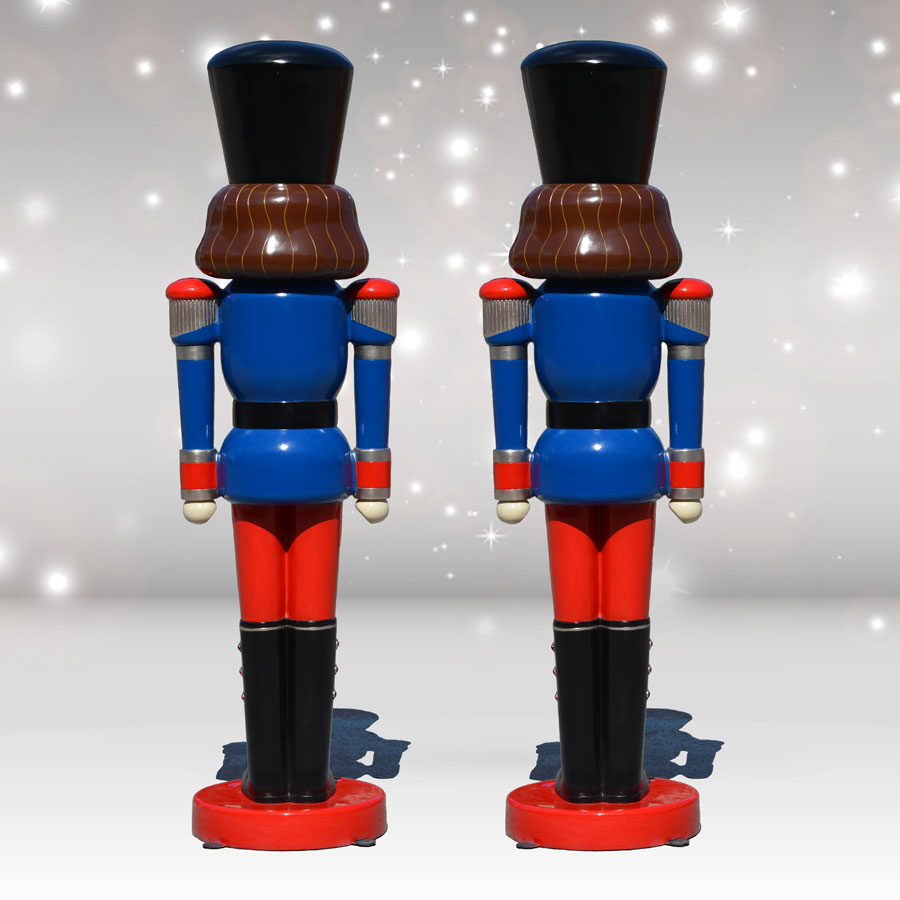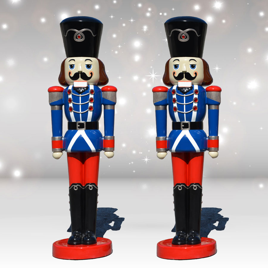 This pair of Nutcracker Soldiers stand at rapt attention and can be placed either indoors or outdoors - place them at the end of driveways, on walkways or at entrances to commercial functions to add festive fun and flair. These premium-quality fiberglass decorations are made from top-notch, chip-resistant materials that will withstand inclement weather beautifully. They are intended to last for season after season of childlike charm, and bring delight to all who see them.