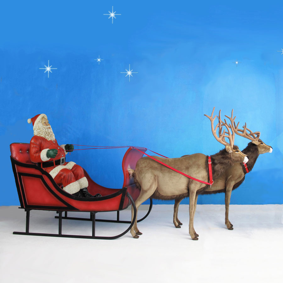 Invite children aboard for a ride with St. Nick with this amazing 11-foot wide life-sized Santa, sleigh and two reindeer set. This collection includes a durable fiberglass sleigh with metal runners, a lifelike fiberglass Santa and a pair of ride-on Hansa reindeers made with meticulously hand-cut fibers. The sleigh holds up to 250 pounds (great for piling high with gifts) while each Hansa reindeer holds up to 150 pounds each. This set is designed by Christmas Night Inc. and made by Heinimex and Hansa.