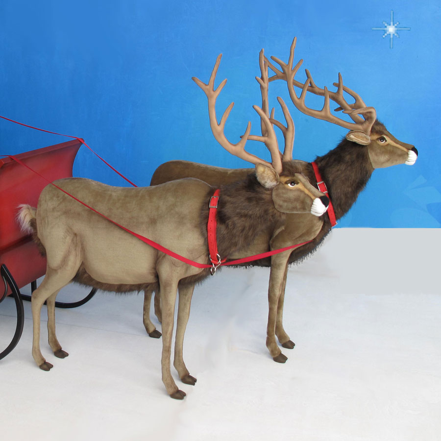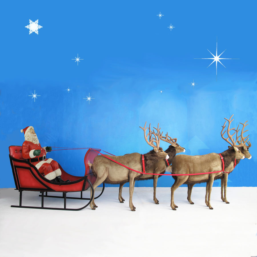 Get everything you need for an enchanting and memorable holiday display in your home or business with this striking Life-Sized Santa, Sleigh and Four Reindeer set. It includes a durable fiberglass sleigh with metal runners that can hold up to 250 pounds, a realistic fiberglass Santa and four Hansa reindeers made with hand-cut fabric from the Portraits of Nature collection. The ride-on reindeers and sleigh are designed for interactive use, so you can invite children to go for a ride with Santa. Designed by Christmas Night Inc. with pieces by Heinimex and Hansa, this is the ideal all-inclusive Santa set for shopping malls and other businesses.