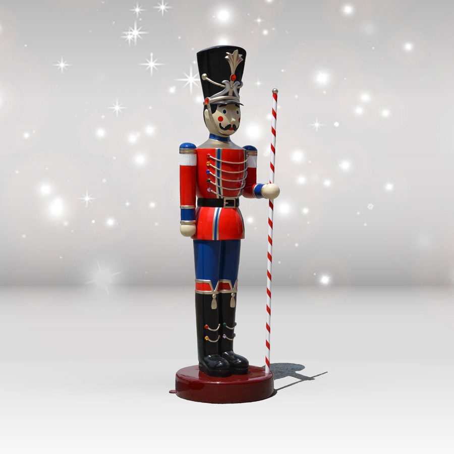The Toyland parade leader is here! Our 6.5 feet tall Christmas toy soldier is always at attention to spur the imagination of children everywhere. This outdoor toy soldier has a red and white baton in his left hand that adds a festive touch. The chip-resistant fiberglass is lightweight and decked out in bright colors, from the red overcoat to the tasseled boots. Place him by the fireplace at home, at your store's entryway or in the middle of a community Christmas Park for all to enjoy.