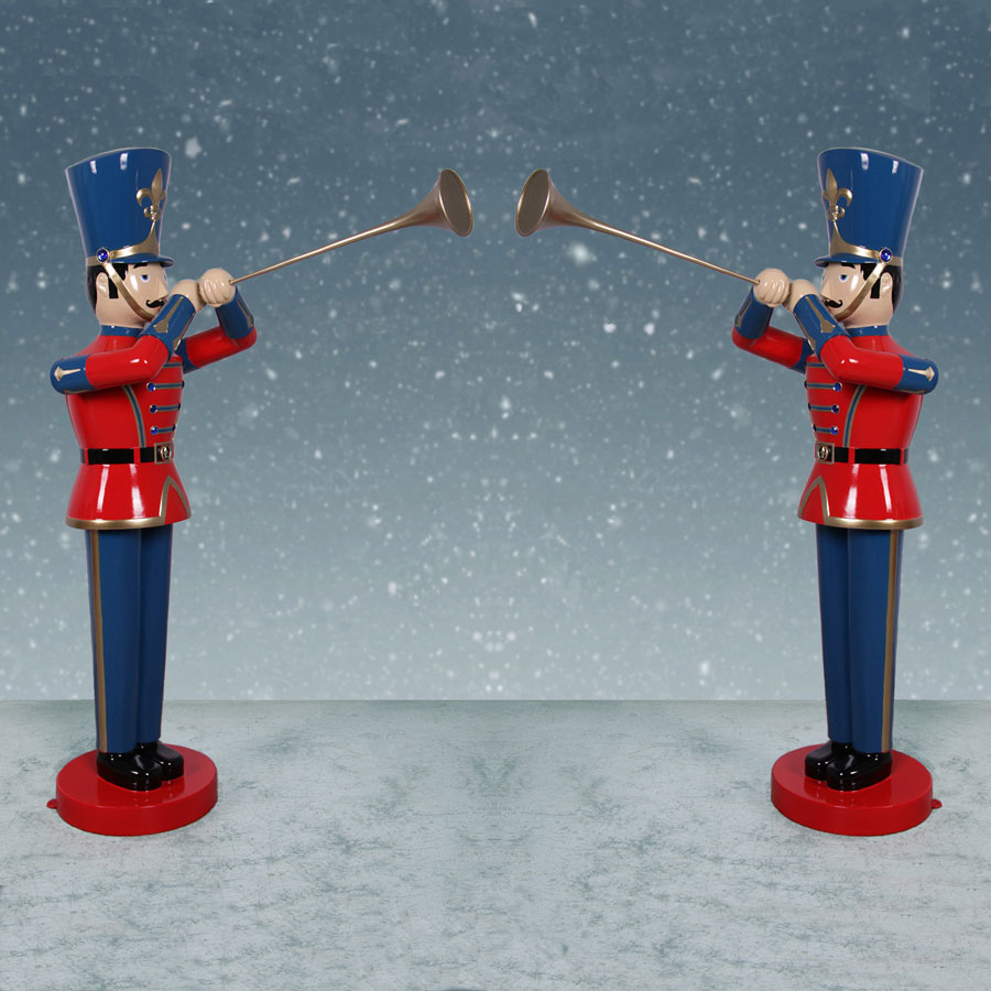 Tradition meets childlike wonder in this life-size Christmas toy soldier with trumpet pair manufactured by Heinimex. Anyone familiar with the image of bugle players flanking an entrance, walkway or procession will adore these sculptures. Standing 6 feet tall, they are dressed in classic toy soldier uniforms and made from chip-resistant fiberglass. Buying this toy soldier with trumpet statue in pairs helps you save big on upfront and shipping costs versus ordering individually. So line your front door, fireplace or benches with these two handsome trumpeters!