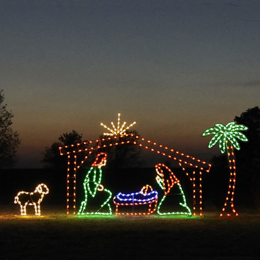 Manufactured for long-lasting quality, the 22-foot wide Holiday Lights LED Nativity display by Holiday Lighting Specialists will help you recreate the magic of Christ's birth for seasons to come. Ideal for businesses and churches, this six-piece set depicts the Holy Family, a stable with star, a standing lamb and a palm tree made from 424 commercial-grade C7 LED lights. The pieces arrive pre-lit and ready to install into the ground with included guy wires. If you plan to display this set on a solid surface, you may use seven floor stands. (See item 77792 below)