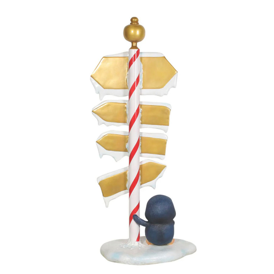 North Pole Sign with Baby Penguin points the way to Santa's Workshop, Seal's Castle and Candy Cane Lane! This fun sign evokes the magic of the north Pole and the charm of winter wildlife. It is made of durable and chip-resistant fiberglass and can be used outdoors. This North Pole sign stands on a sturdy base with security plates.