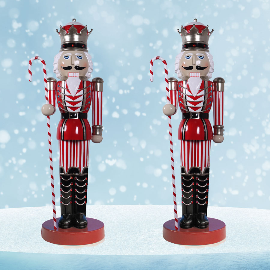 Designed by Christmas Night Inc. and made by Heinimex, these absolutely stunning life-sized nutcracker figures are an essential for your traditional indoor or outdoor holiday display. They are constructed from chip-resistant fiberglass that's durable enough to withstand the elements. All of the giant Christmas nutcrackers from the noteworthy Christmas Night Nutcracker Collection offer exceptional detail and exquisite embellishments, including meticulously painted facial details and glossy finishes. This life-sized pair of nutcrackers statue are depicted carrying candy canes for a classic finishing touch.