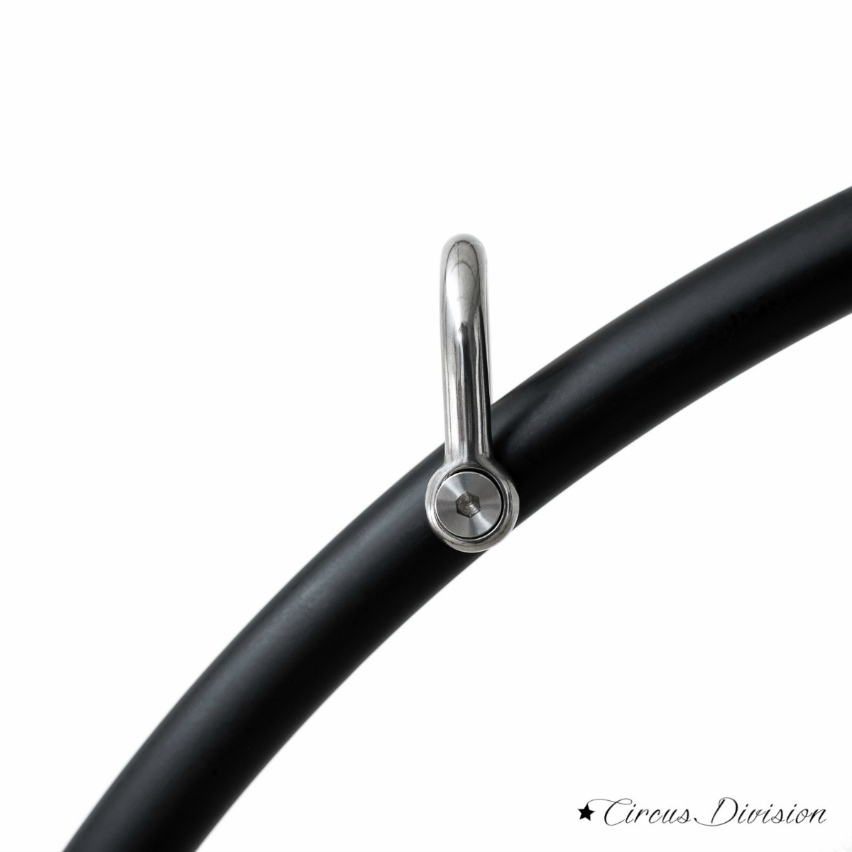 A Aerial Hoop is generally set up using two types of rigging connections, centered or double. The number of connection points on an aerial hoop will depend on how it will be used, the intended effect, and the performer's skill level. Double tabs prevent the hoop from spinnig so it has a trapeze-like swing. A single tab swing along more than one axis, like a dance trapeze. The Play hoop is constructed with carabiners to connect the rigging to, rather than welded tabs. This a big advantage as the hoop can be set up as either a centered tab or a double (trapeze like) tabs. This method using carabiners rather than welded tabs also makes it much easier to do safety inspections of the connection point(s). It gives the hoop more range of motion for the double connection style hoop.