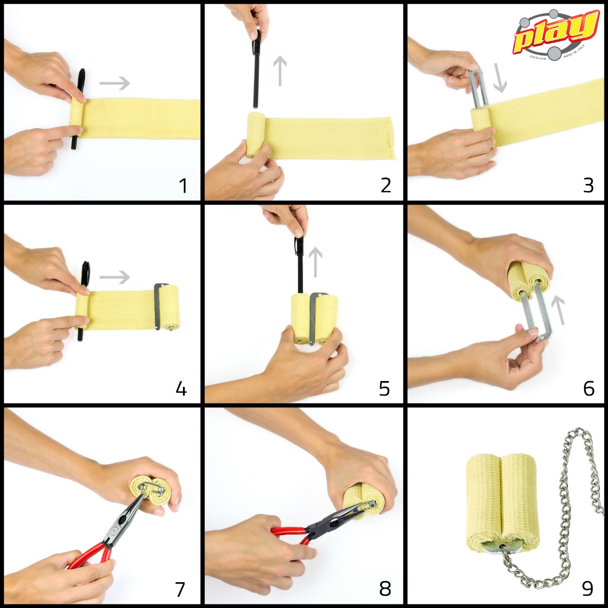 Play Juggling Fire Poi Chain set features a new easy to re-wick head system. This is a very nice low cost start-up set for beginners who want to lear fire poi swinging. The wicks are made from Puro 100% Kevlar, with a bearing swivel, and stainless steel change. It is a very nice simple construction.