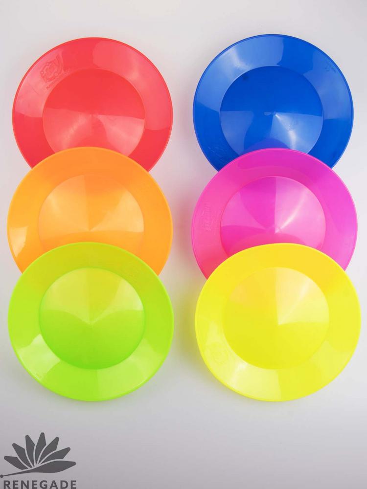 This is the largest model spinning plate with a diameter of 10 inches and a height of 1 5/8 inch. The plastic is hard about the same as the Renegade Plate. It has a weight of 105 grams, so this plate would also hurt of the students are throwing plates at each other. The larger size and weight makes the plate spinning longer and is just as easy to learn with. It does not hurt if you hit yourself while trying to learn the prop. This plate has the best visual look as it is bigger size. It can be purchased with a two piece wood stick, which is very nice but hard to clean compared to plastic sticks. The Hernys plate cost considerably more so it is better suited for a performance than teaching large classes.