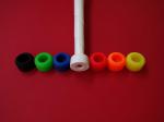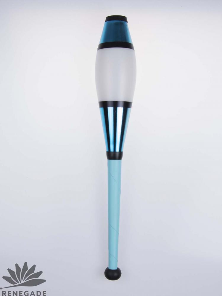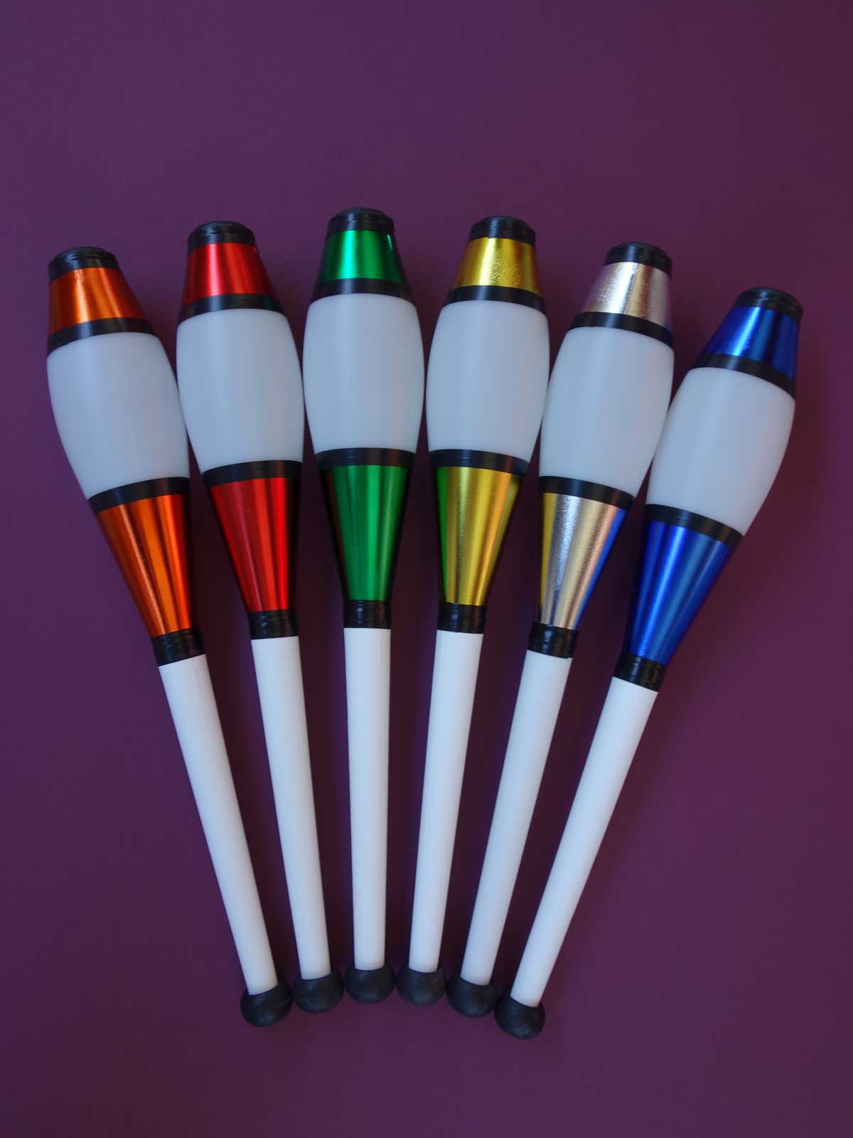 Each PX3 Vegas juggling club is custom made to order. Select colors for the body decoration, handle, center ring, cap and knob, and choose between a round or flat bottom knob (round is pictured).
