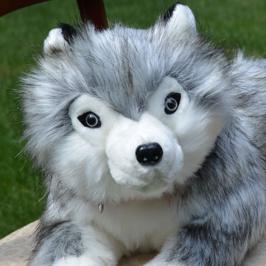 Plush Husky Lap Dog hugs. Discover the Joy of a Ditz designed Lap Dog from this lovable Husky dog that will bring a smile to your face and put joy in your heart. The "coat" of the Dog is meticulously cut by hand, and manufactured in small lots to Ditz Designs exacting specifications. Note that each Dog is hand made so each one may vary slightly in its final look.