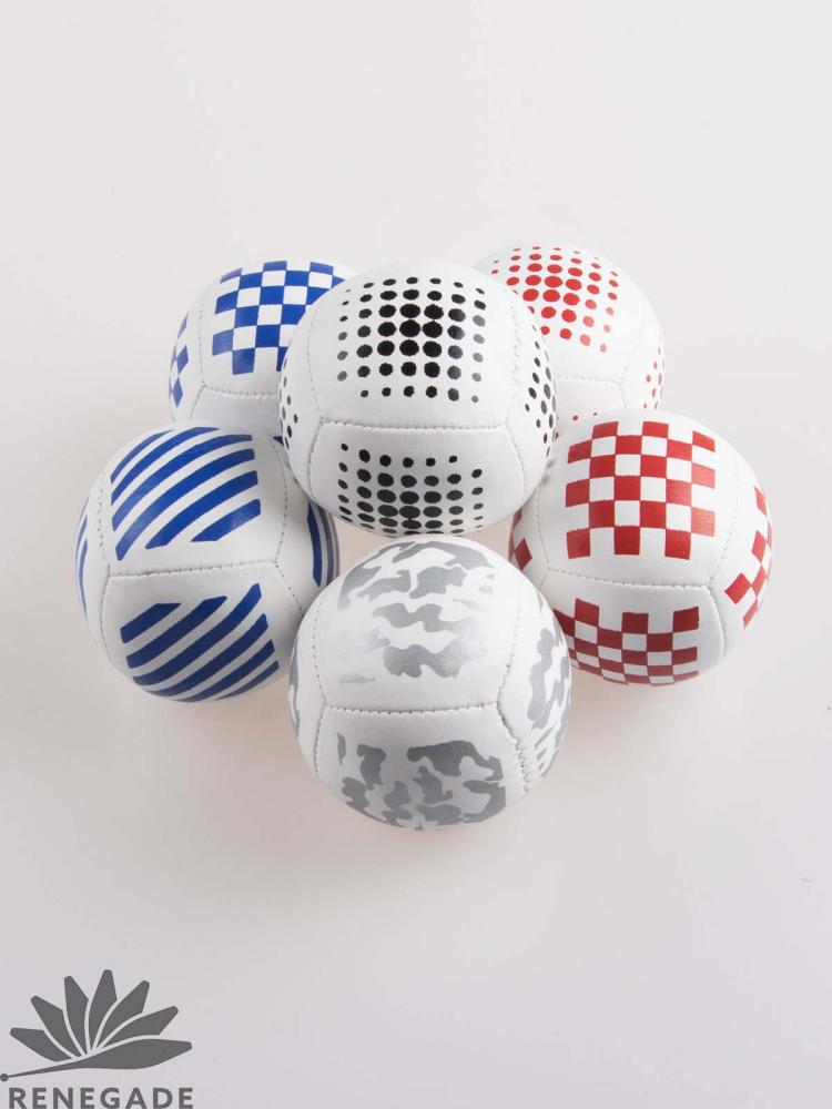 These juggling beanbags are the same as our white Polyurethane (PU) bags, but have a unique screen-printed design on the fabric. The prints are high-quality and look great both up close and on stage. These prints are only found on Renegade Juggling beanbags, and the ink we use is specially formulated to be applied to PU cloth so it does not fade, chip or wear off.