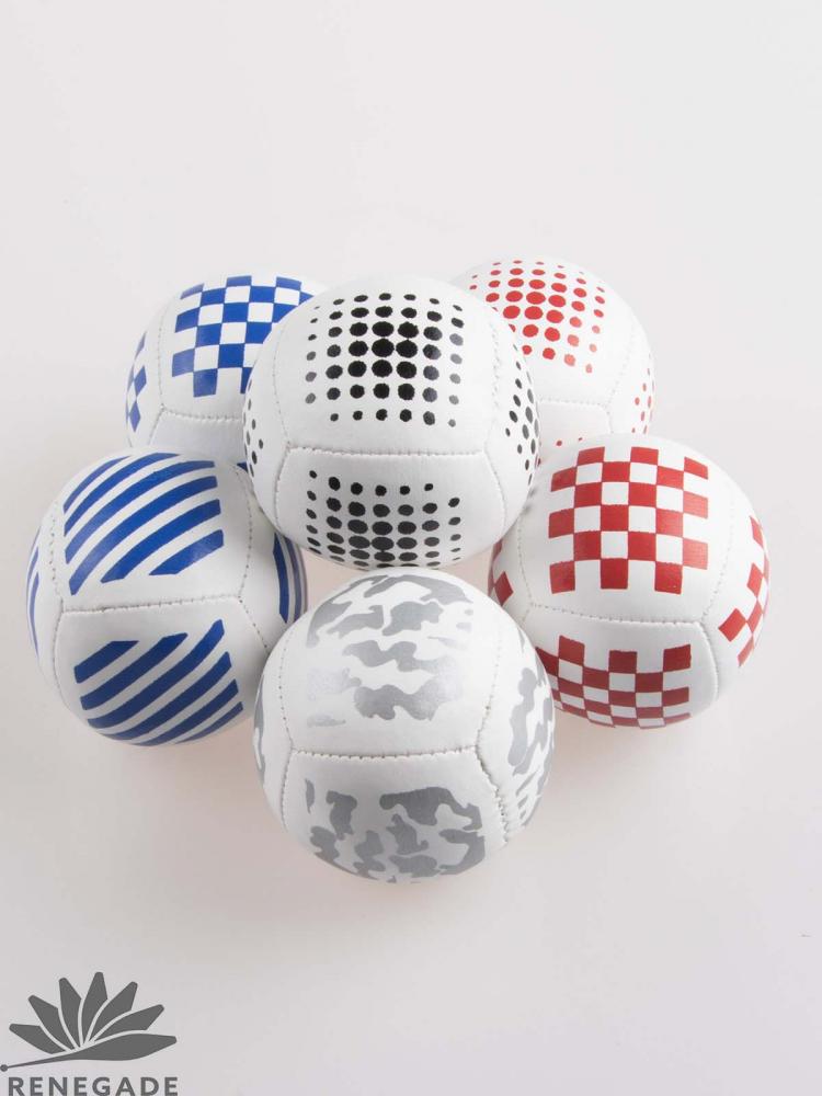 These juggling beanbags are the same as our white Polyurethane (PU) bags, but have a unique screen-printed design on the fabric. The prints are high-quality and look great both up close and on stage. These prints are only found on Renegade Juggling beanbags, and the ink we use is specially formulated to be applied to PU cloth so it does not fade, chip or wear off.