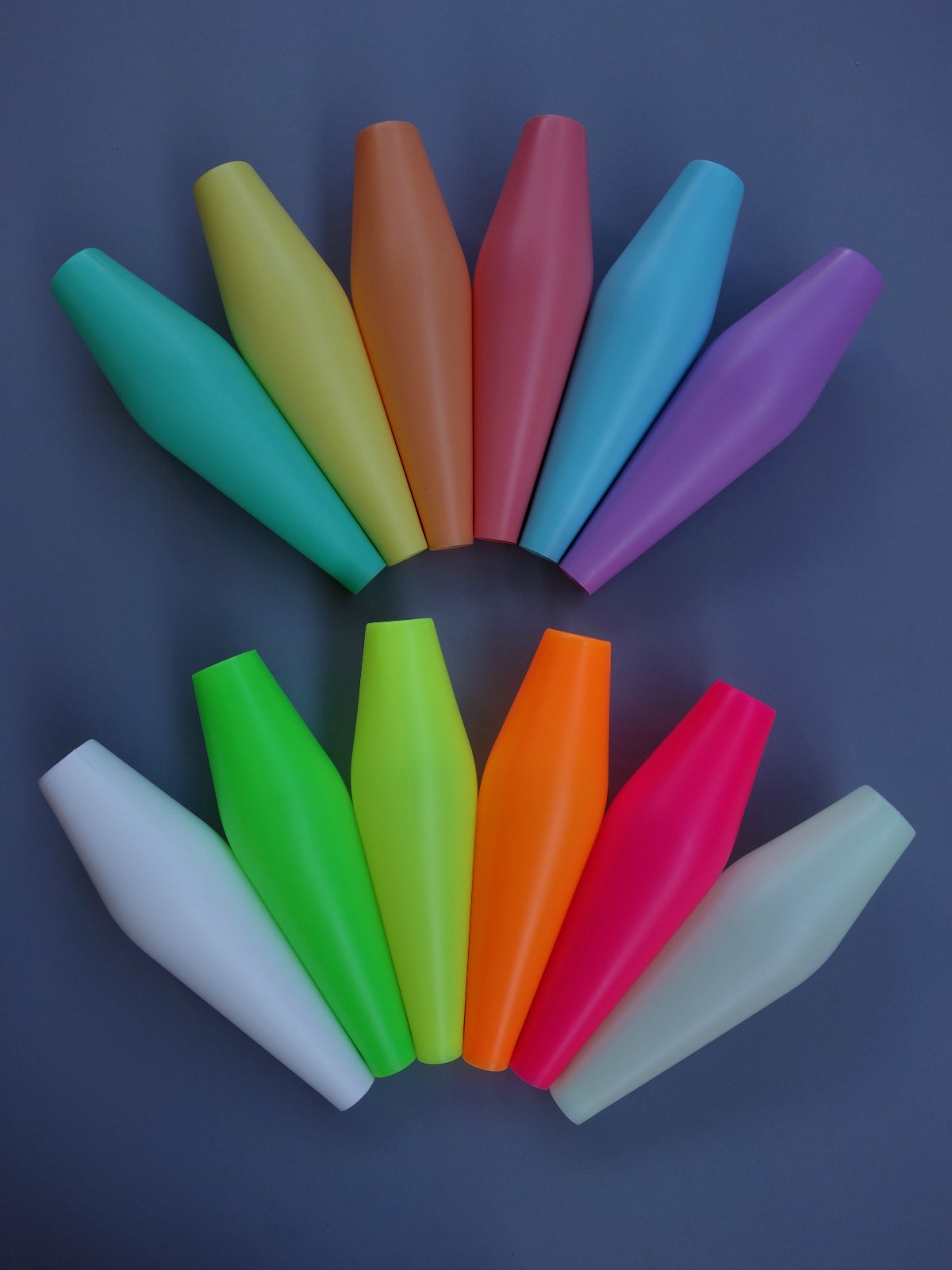 The PX4 Quantum is very similar to the original Play Juggling club. “PX4” refers to the fiberglass dowel used to make this club in place of the original plastic PX3 dowel. The fiberglass dowel is very stiff with no flex, similar to a wood dowel. The model name Quantum refers to the club body and handle length. The Quantum has a long body and short handle, the same size and proportions as the Henrys Delphine. The total length of a Quantum and Sirius club is the same.
