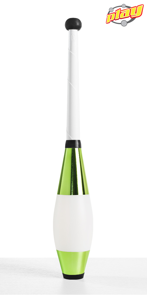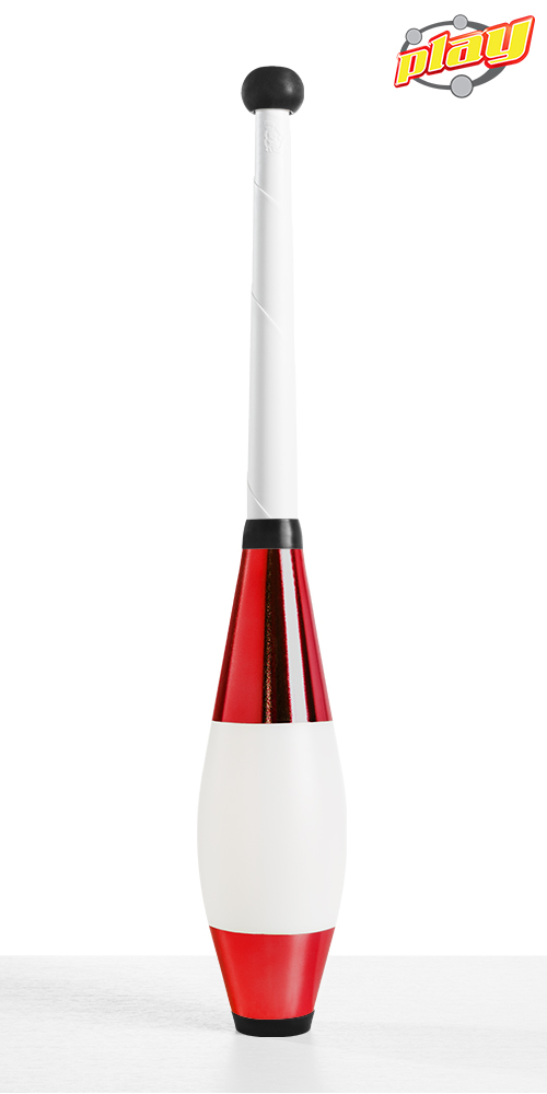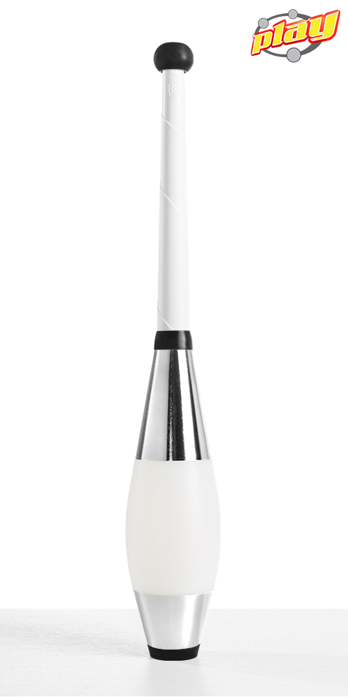 The Px4 Vegas is very similar to the original Play Juggling club. “PX4” refers to the fiberglass dowel used to make this club in place of the original plastic PX3 dowel. The fiberglass dowel is very stiff with no flex, similar to a wood dowel. The only difference between a PX4 Vegas and a PX4 Sirius is that the Vegas body is brilliantly decorated with electrostatic chrome plating bordered by trim tape. The Vegas club has a short body and long handle, the same size and proportions as the Henrys Pirouette and Sirius.