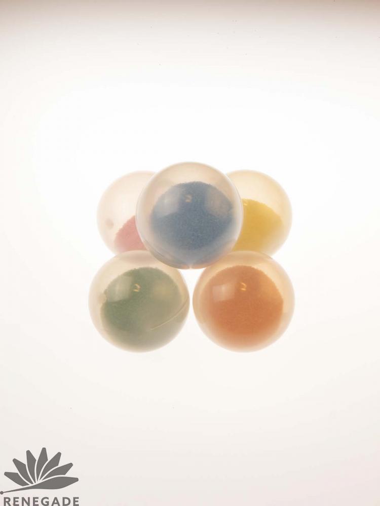 Very original great Russian Colored Sand Ball! Like these. The sand color is thorough and competent. The bubble is firm with some give. There is a small tab, a part of the construction, inside the ball that seems to be relevant to the heat weld, it is not visible except in close inspection and causes no noticeable weight imbalance. The Russian effect in these is crisp and positive. While some jugglers steer away from Russian effect, it is worth embracing as it brings a set of valuable points of awareness to practice. When one throws funky due to unawareness or other gap in true technique, a little tempest cyclone develops in the ball. This feature helps train throwing style. Grip and catching is also benefited because one needs to zero out the fill motion dynamics in each catch, and this builds greater stability into patterns and transitions. Renegade Juggling has put much focus into product development over many years. RJ products demonstrate clear design understanding and thorough production tuning results. Here is another example of this brand strength.