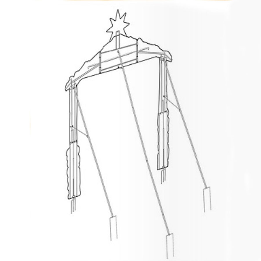 Two-dimensional outdoor Stable and Star. The flat metal stable is printed with high resolution paint that resists fading. Details such as the thatched roof, stone pillars and dove capture and bring the Christmas story to life. It is designed to complete the Three Kings Real Life outdoor Nativity set. The stable folds for easy storage.