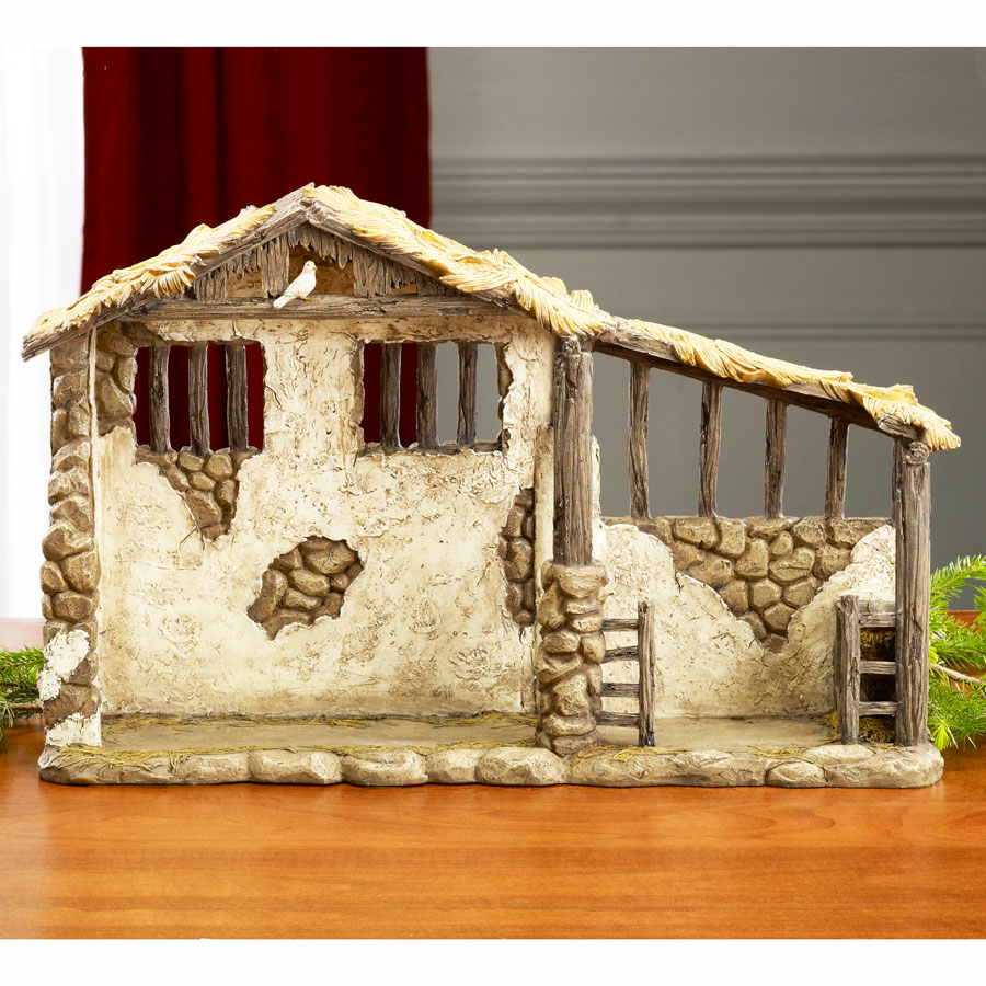 Complete your Three Kings Real Life Nativity Collection or any other 14-inch scale nativity set with this high-quality lighted nativity stable by Three Kings. The realistic stable features stone and stucco walls, weathered log beams and an authentic palm-thatched roof to honor Christ's humble beginnings. The stable is made from polymer resin and comes with a bright battery-operated light that illuminates the figures within.