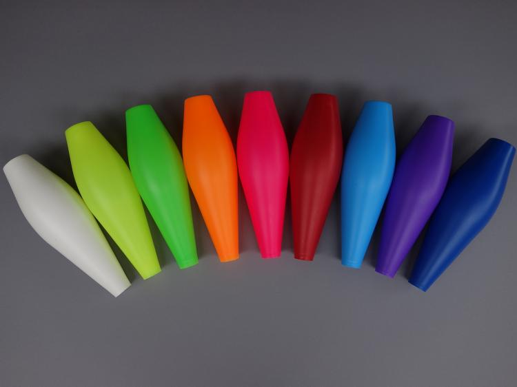 Club passers will find this club very similar to the 95mm. The differences are that the smaller width can reduce the possibility of mid-air collision, and the slimmer handle makes releasing three clubs from one hand a little easier. Additionally, the smaller body is easier to catch on the wrong end, and the 85mm can be ordered in a lighter weight. We can make this un-decorated club as light as 210 grams, and 230 grams for the decorated version. If you juggle outdoors we recommend choosing a heavier club (at least 240 grams).