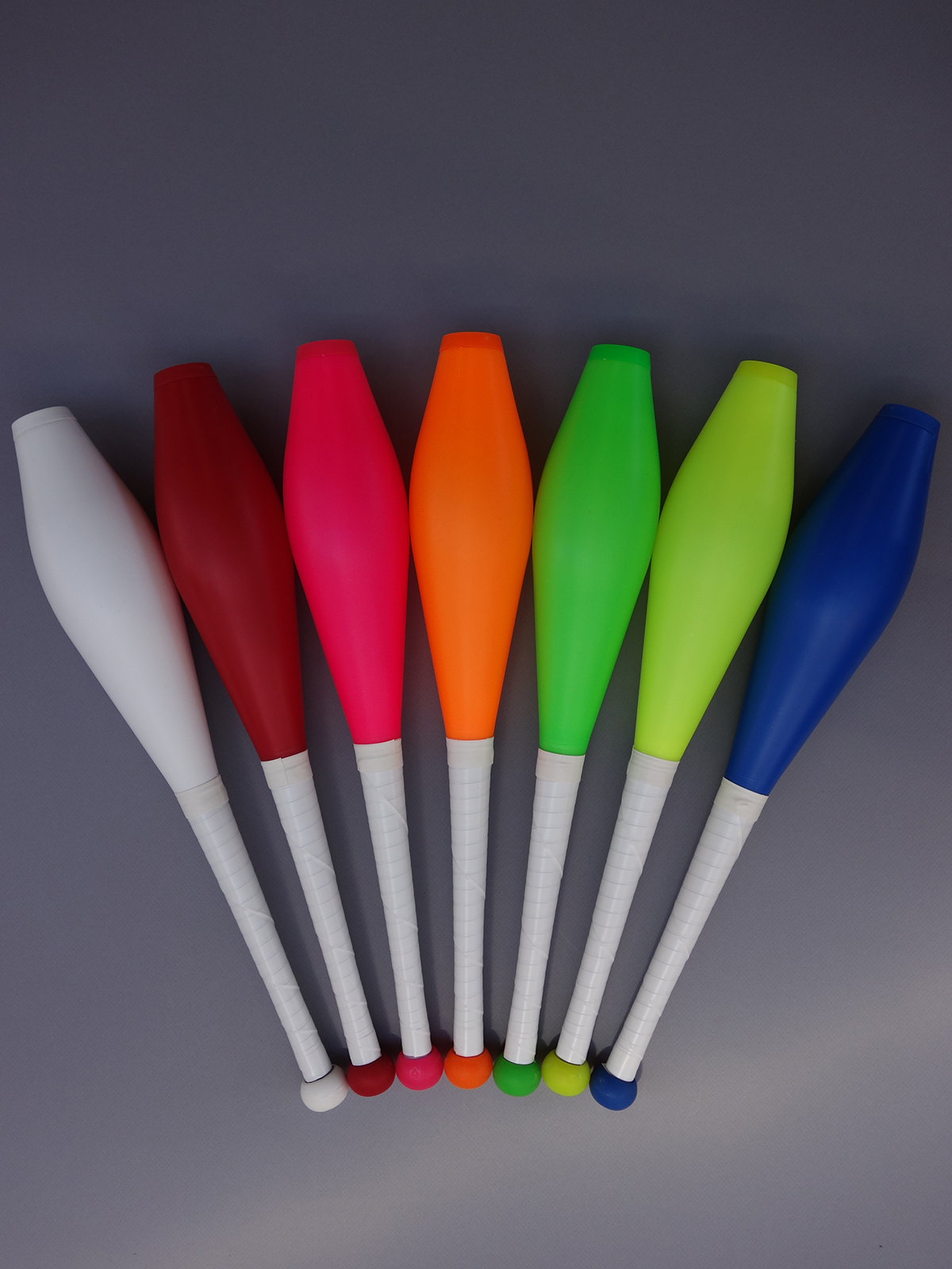 You can select the color of the body, knob, and cap, allowing for many possible color combinations. Knobs are round and screw-on. The standard length (20.25 inches) has a slow and lofty spin, making it great for body tricks and an all-around great club for passing and solo juggling. Shorter jugglers may prefer to order clubs with shorter handles (between 19.0 and 19.75 inches) but in general, most people order standard length.