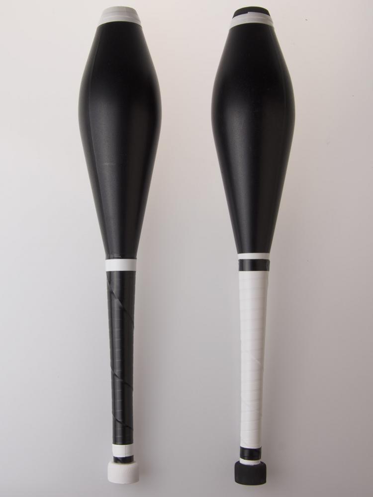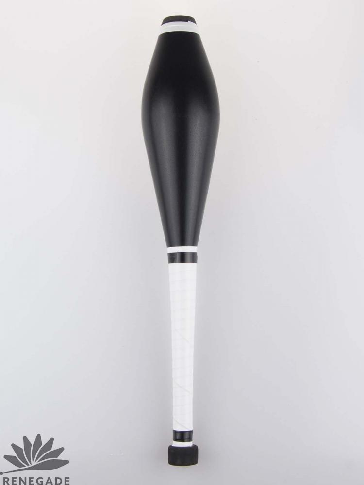 Renegade now offers our 95mm juggling club in an elegant black and white color scheme. The black bodies stand out beautifully against light backgrounds. These clubs come in two color combinations: black taped handle with white trim tape and white rubber, or white taped handle with black rubber.There are a few draw-backs to a black-bodied club however—scratches show up a bit more, and black clubs are harder to see when juggled in theaters with black ceilings.