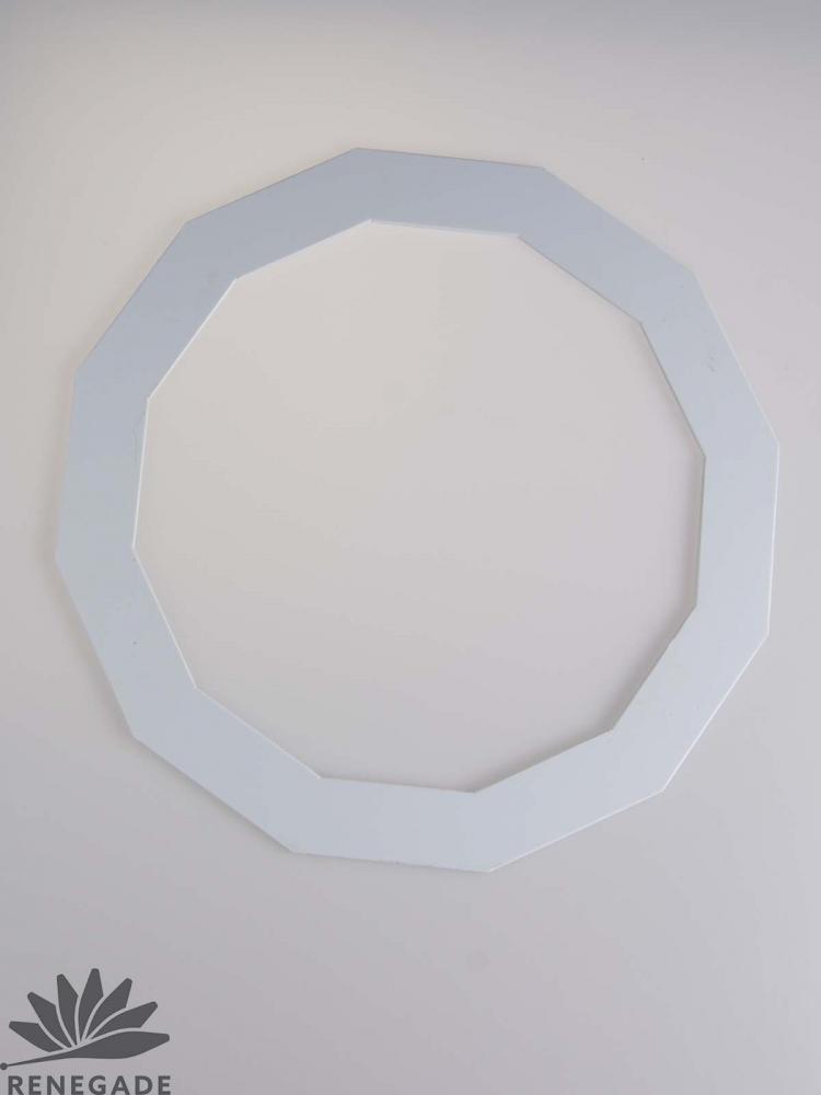 This 12-sided polygon ring has an interesting look when juggled, and its unique shape will no doubt lead to new tricks. It is similar in size to the standard ring with a 33 cm (13 inch) diameter, and is very close in shape to a round ring. The perfect stiffness and light weight (98 grams) make the rings juggle very well. The ring is made of 1/8 inch thick white plastic, and the edge is flat and beveled.